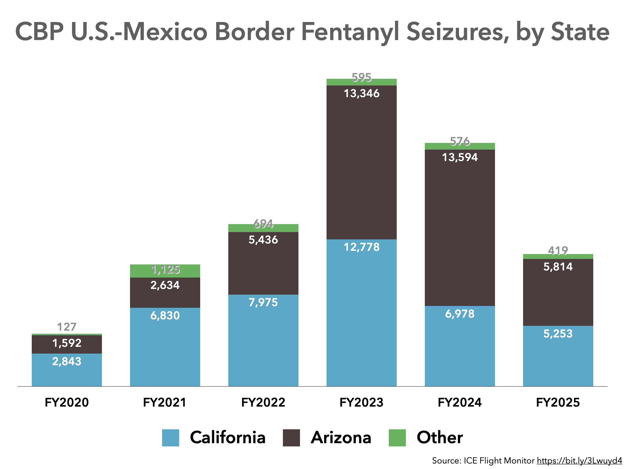 Similar to past years, CBP made 96 percent of its fentanyl seizures in California and Arizona in fiscal 2025. For the first time in three years, seizures in California exceeded seizures in Arizona.