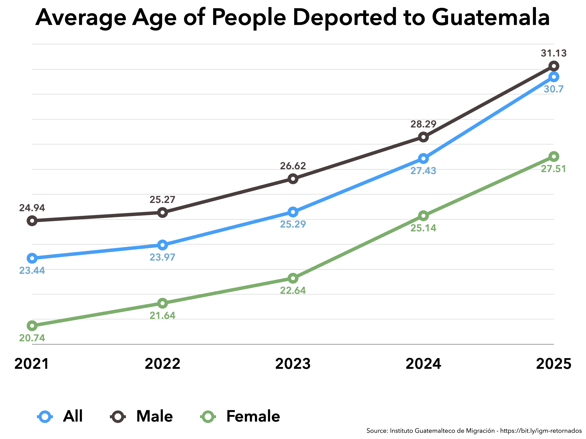 The IGM’s own data point to a considerable increase in the average age of deported Guatemalans: from 23.4 years old in 2021 to 30.7 years old during the first nine months of 2025—a seven-year increase. When the deported population gets older, that very likely means that it includes many more people who had been living inside the United States for a long time. People arrested in the U.S. interior, likely after being rooted in U.S. communities for years, are now very likely the majority of the (currently reduced) population of people now being deported to Guatemala.
