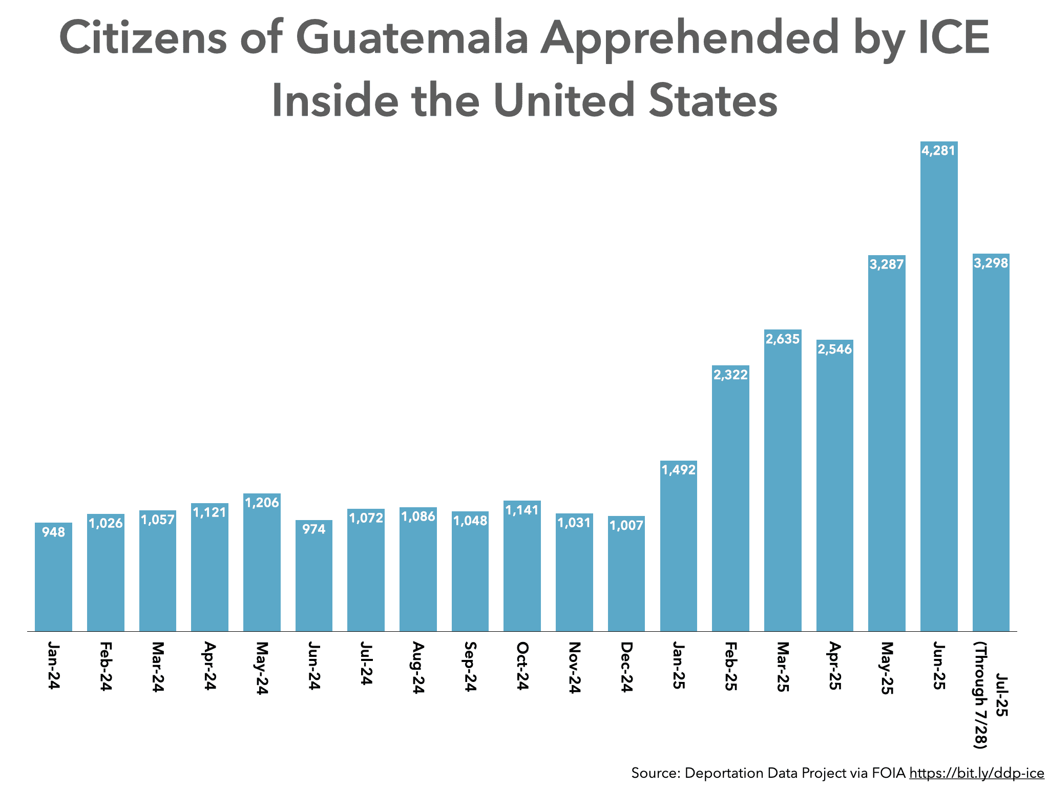 Information that the Deportation Data Project obtained through a Freedom of Information Act (FOIA) request showed ICE’s interior arrests of Guatemalan citizens more than quadrupled from December 2024, the Biden administration’s last whole month (1,007), to June 2025, the last whole month in the FOIA dataset (4,281).