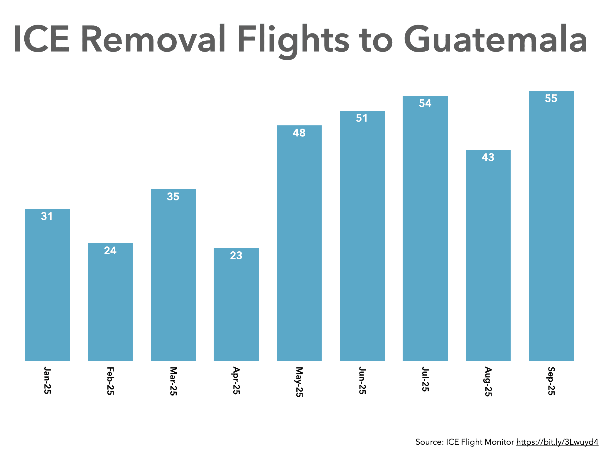 Further evidence of increased ICE deportations of Guatemalan people from the U.S. interior comes from the ICE Flight Monitor project managed by Human Rights First. The Monitor detected 31 deportation flights to Guatemala in January; that increased to 55 flights by September.
