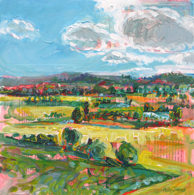[Small Wonders Daily Paintings by Polly Jones] Mown Fields 2 by mixed media acrylic landscape by Polly Jones