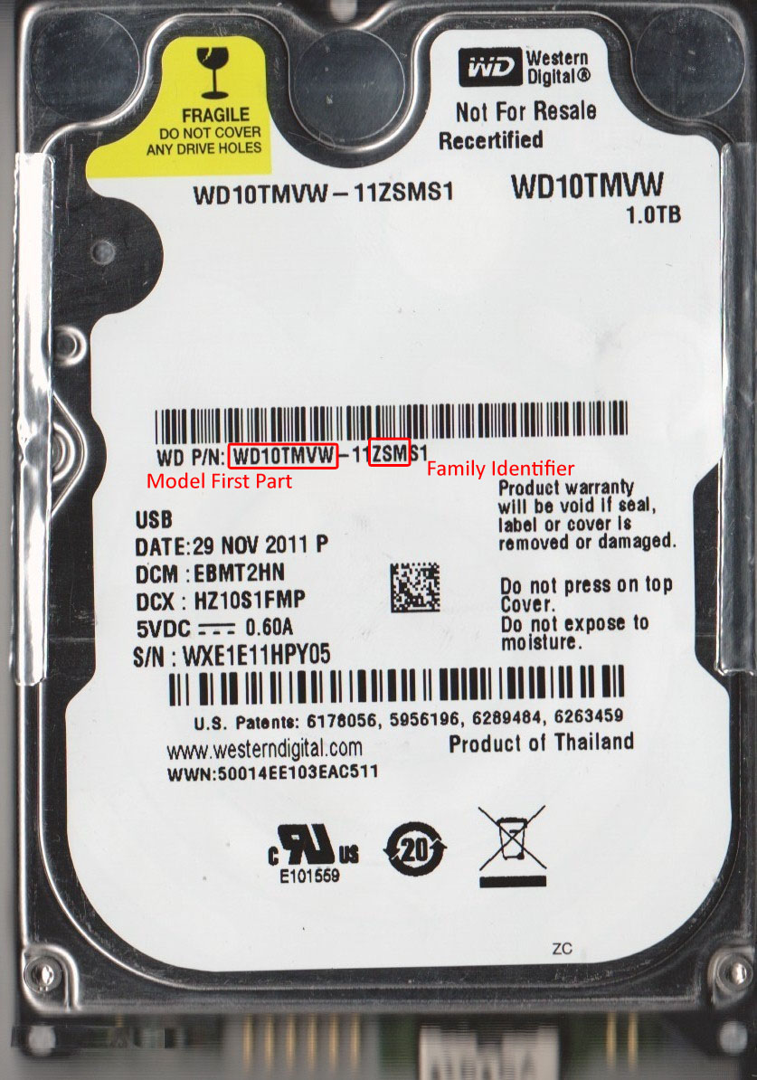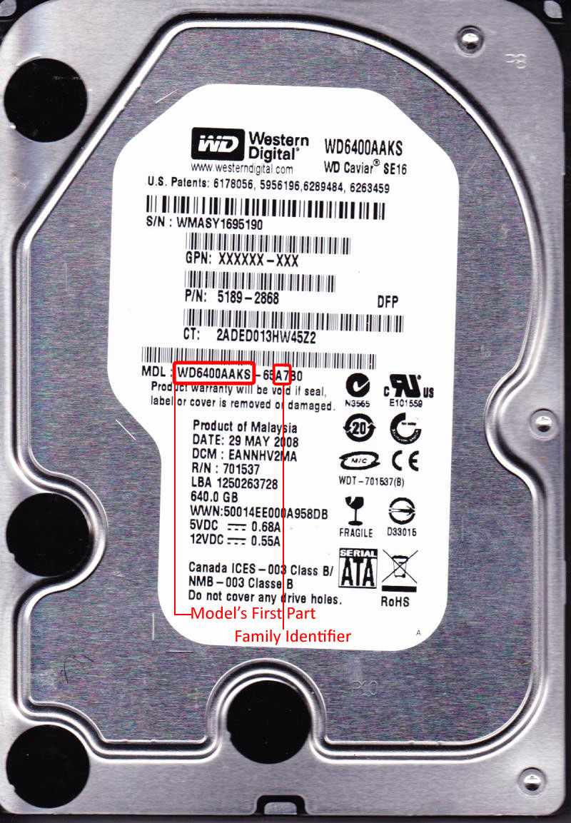 1. First part of model number and 2 or 3 middle characters of the second part. Example: WD6400AAKS-65A7B0, WD10TMVW-11ZSMS1