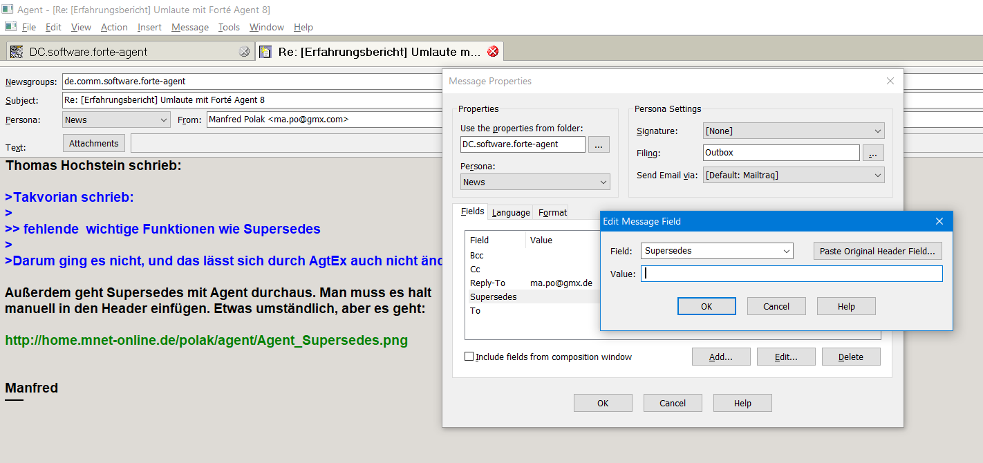 Forté Agent, um mit ihm des Lesen und Schreiben von Umlauten möglich