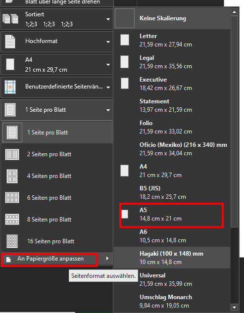 > Beim Ausdruck 2 Seiten pro Blatt A5 auf A4 ist das aber problemlos