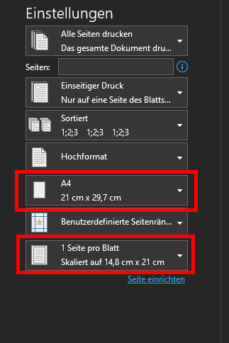 A5-Papier quer eingelegt und die A4-Seite so auf zwei Blatt A5 gedrcukt