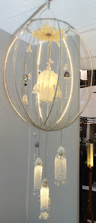 Fur (okay, Ostrich feathers) on a chandelier with three appendages that look a bit like jelly fish, all suspended from a feather flower, and contained (except for the appendages) in a steel egg shaped frame. Yuk.
