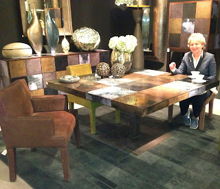 Inside, we started back at the vendor booth we started with, to make our "buy". The vendor is from Belgium (no not more of that Restoration Hardware looking junk!), and is one of our favorites. We bought several wonderful things here, but the two most important were the selenite chandelier that I talked about in my Day 1 blog, and a dining table with parchment (thin leather) top in shades of tan, grey, crème, and brown, each divided from the other by the thinnest of inlaid wood lines. The top sits on a simple steel base.