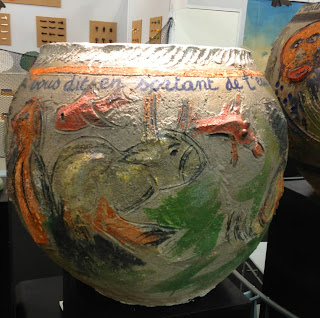 Artist A. Digan: Huge handmade terra cotta pots brightly painted and hand carved, below