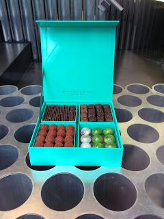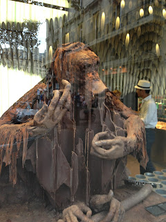 Chocolates at one of the many Paris confectioners, beautifully presented, above, and a Gorilla made of chocolate, but this one with the itchy middle finger, below.