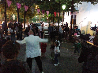 A street fare across the street from L'Endroit gets lively with a band singing. "it's only rock'n roll" in French, with dancing children being led by a clown In white coat), not sure if he was professional or just a passerby.