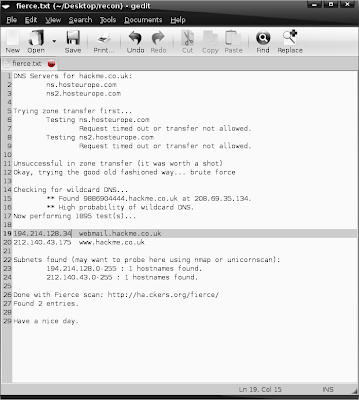 DNS, For this I will use a couple of tools. Fierce Domain scanner is a favourite of mine, and has served me well before.