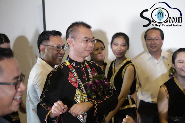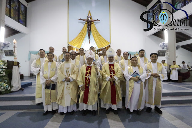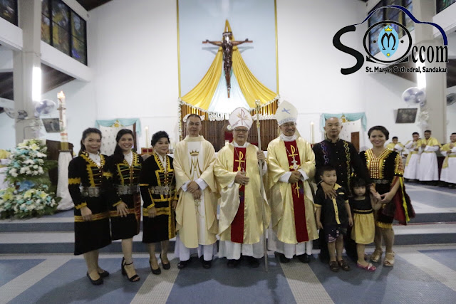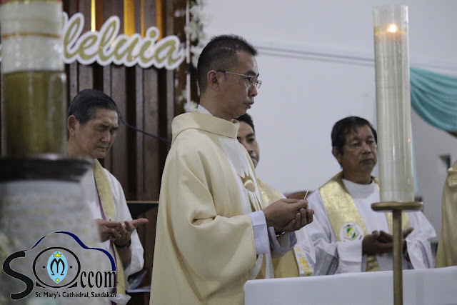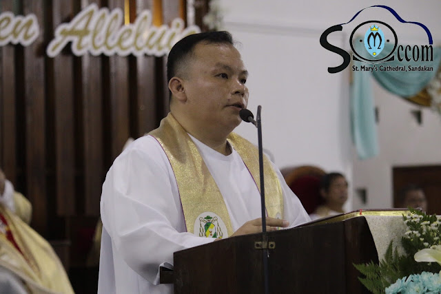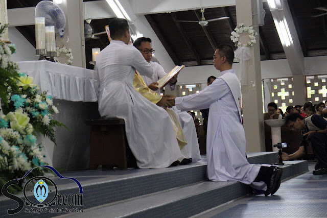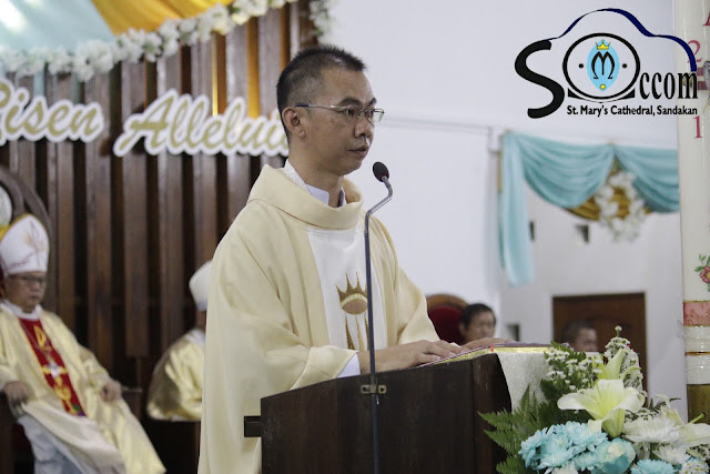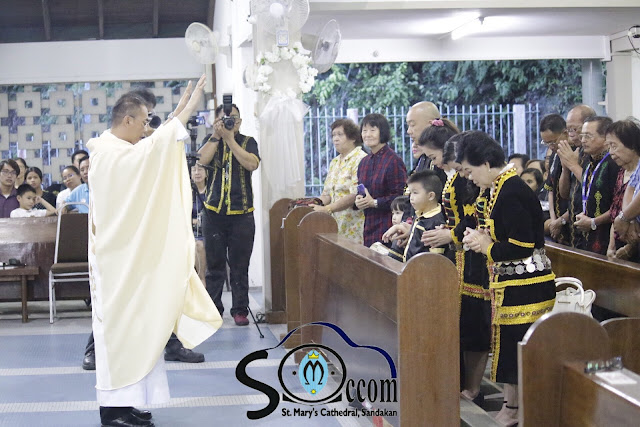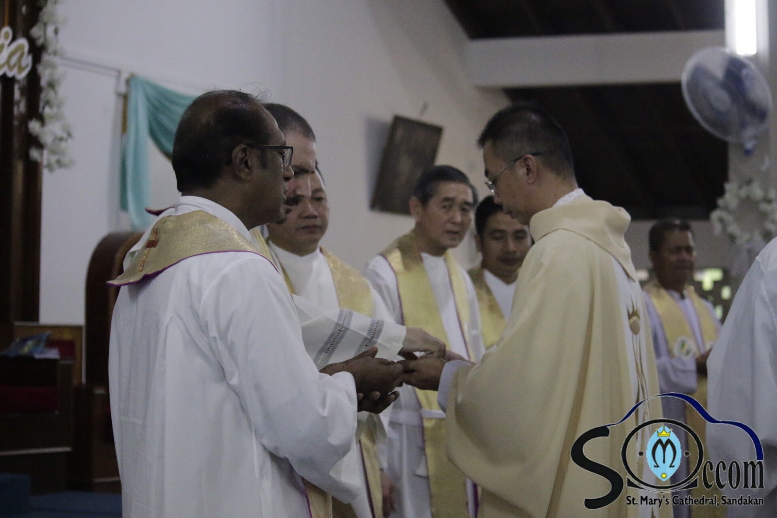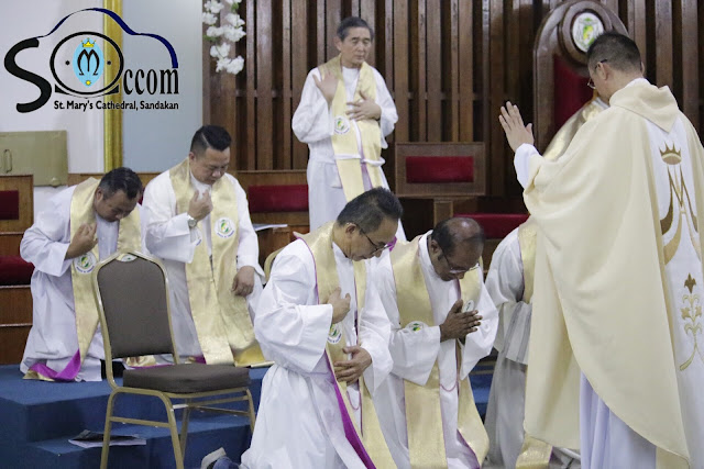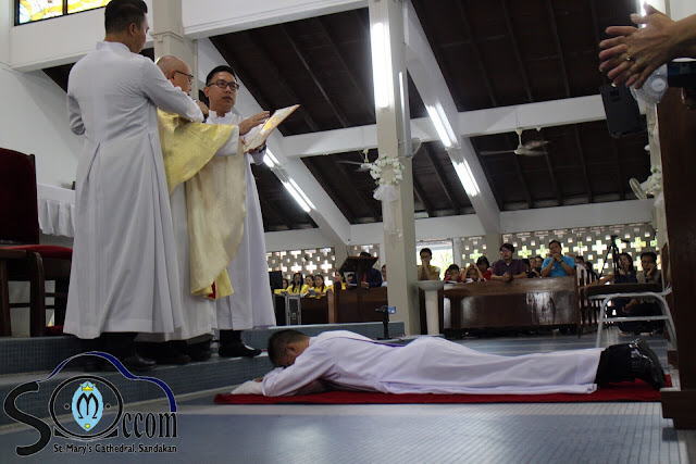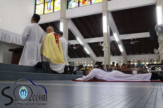 Rt. Rev. Julius Dusin Gitom, Bishop of Sandakan Diocese, solemnised the ordination Mass, concelebrated by Most Rev Simon Poh, the Archbishop of Kuching Archdiocese, and 14 priests. The first part of the Rite of Ordination took place after the proclamation of the Gospel. The Rector of St. Dominic Lahad Datu, Fr. Simon Kontou, in the election of the candidate officially proposed Deacon Dafrinn for the priesthood ordination. He stood before the bishop who questioned him on his commitment to perform the duties of the Order of the Priesthood. This was followed by the Litany of Supplication. The priest-elect prostrated himself as a sign of total dependence on God while the congregation knelt. Then Laying on of Hands on the head of the elect was performed. He knelt before Bishop Julius who laid his hands on him in silence followed by Archbishop Simon Poh and the rest of the priests. After the Prayer of Ordination was the Investiture with stole and chasuble. The newly ordained Fr. Dafrinn Diwol was adorned by the parish priest of St. Mary's Cathedral, Fr. David Garaman. The ordination rite concluded with the bishops and all the priests welcoming the newly ordained into the Order of the Priesthood by giving him the sign of peace, followed by a big applause from the congregation. Right after the final blessing, thank you speeches were delivered;