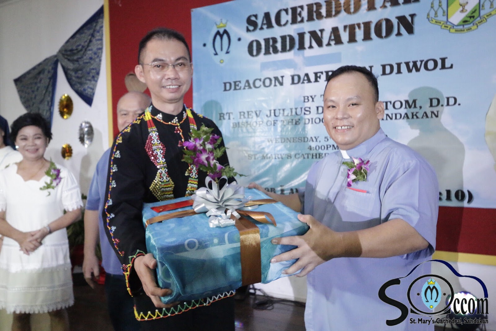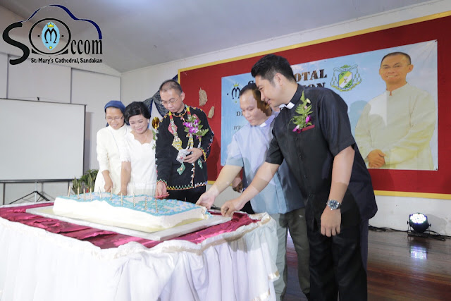 As a mark of Thanksgiving, the St. Mary Cathedral Parish Pastoral Council (PPC) hosted a dinner reception right after the ordination ceremony in the Parish Hall. Pilis Malim, the PPC and organising Chairman in his welcoming address, expressed his gratitude to God for the blessings for the gift of Fr. Dafrinn Diwol, a priest who hails from this parish. Among his speech, he pointed out to the faithful of the cross that the priests have to bear and carry in their ministry, especially in this vast diocese. He reminded that the weight of the cross that the priests have to bear representing the faithful participation and the burden will be lessened should the faithful live-up to the vision and mission of the diocese. He concluded by conveying his appreciation to all the committee members for the success of the event.