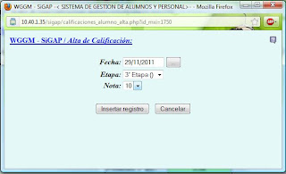 En esta ventana seleccionamos la etapa (que será la Tercera), donde dice Nota elegimos la nota y luego insertamos el registro que sería algo así como grabar la nota. Click entonces en Insertar registro. Así vamos alumno por alumno hasta completar.