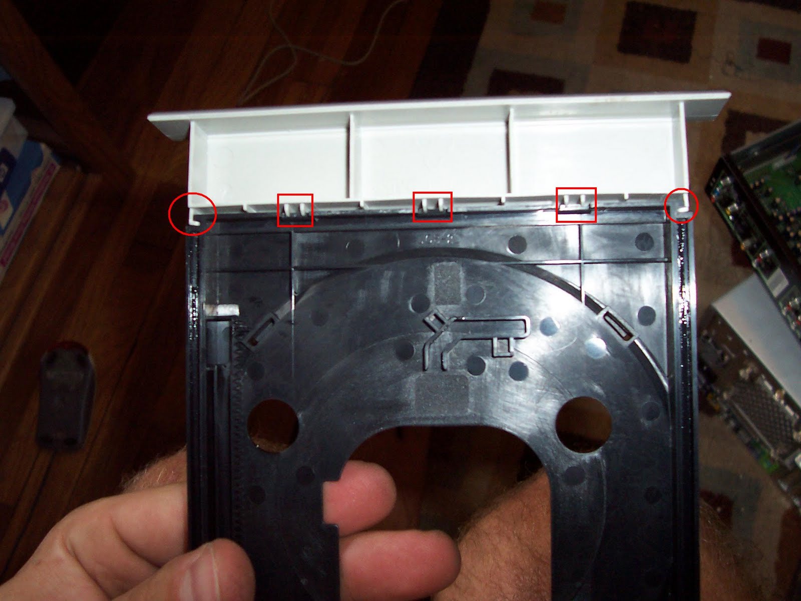 If you look at the picture to the right you will see 3 squares and two circles. The squares are tabs that we need to tilt the drive face to unhook. The two circles will slide away from the camera to disconnect the tray from the tray front in order to separate these two pieces so you can pull the DVD unit from the case.