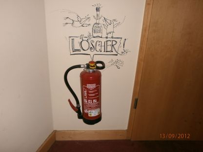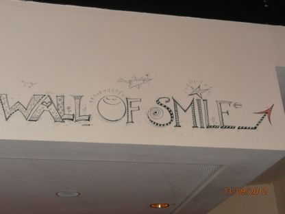 Wer in der Comödie an der Cassa ein Theater-Billet für den I. Rang erworben hat, passiert sie zwangsläufig - die Wand des Lächelns. So kann man "WALL OF SMILE" getrost übersetzen. Und diese Wand ist Teil einer umfassenderen heiteren Ausgestaltung des gesamten Foyers durch