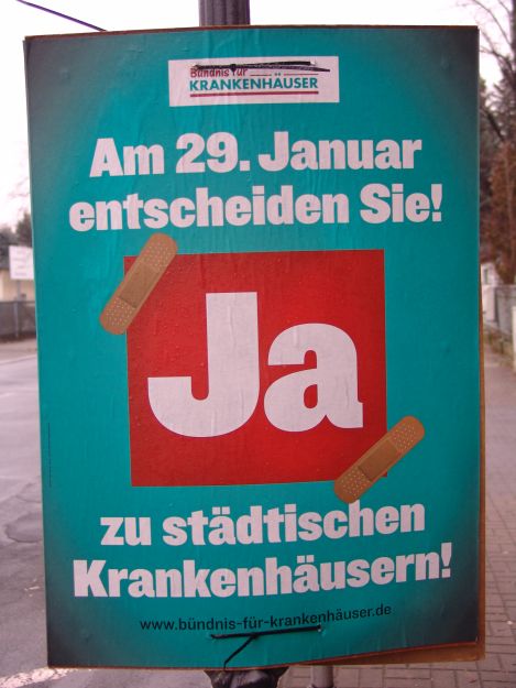 Im Dresdner Stadtmagazin SAX wird das Problem ganz gut auf den Punkt gebracht: „Nun sollen die armen Dresdner entscheiden, ob sie die städtischen Krankenhäuser lieber wieder in der Gewinnzone sähen oder sich eher mit den Mitarbeitern solidarisieren wollen, die letztlich auch die Bedingungen eines Krankenhausaufenthalts sichern. Kann man sie nicht etwas Leichteres fragen?“ (SAX 01/12, online nicht verfügbar)