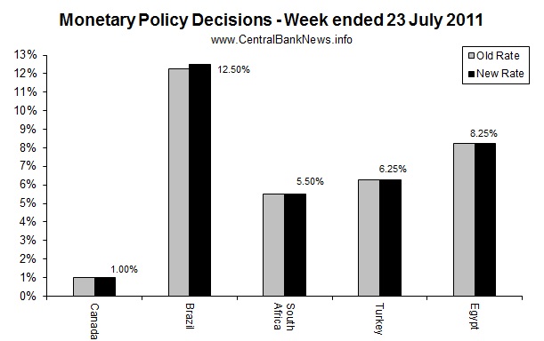 past week in monetary policy saw the Banco Central do Brasil increase its Selic rate by 25 basis points to 12.50%. Meanwhile those that held rates unchanged were: Canada at 1.00%, South Africa at 5.50%, Turkey at 6.25%, and Egypt at 8.25%. Common themes in the media releases were a pretty keen focus on the risks coming from the EU and US debt situations, and Brazil possibly signaled an end to its tightening cycle. Next week there's a few interesting monetary policy decisions due; Israel, India, New Zealand and the Philippines are among those reviewing policy settings, with India the only one expected to move, with consensus seeing another +25bps.