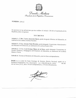 El Poder Ejecutivo emitió este viernes el decreto número 209-13, por medio del cual designa ministro de Educación al doctor Carlos Amarante Baret, en sustitución de la señora Josefina Pimentel.