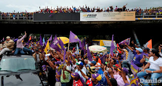 Debido a la gran cantidad de vehículos y personas, la marcha caravana avanzaba a lentamente en tanto que desde los altos de viviendas y en las aceras multitudes lanzaban consignas y slogans a favor de los candidatos.