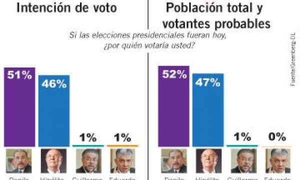 Entre los dominicanos más inclinados a votar, (72 por ciento del electorado), ambos candidatos suben en la preferencia, con 52 por ciento para Medina y 47 para Mejía.
