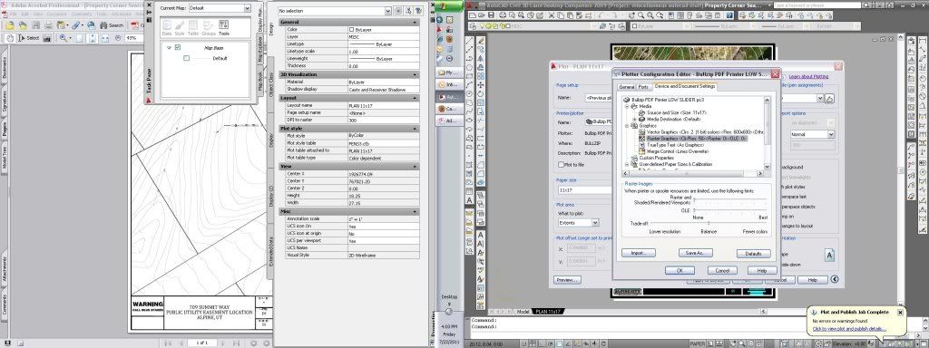 I have gone into the standard printing preferences for Adobe PDF through the Printers and Faxes area in control panel (as well as in CAD, custom properties, when printing) and turned everything I could find as low as possible, also w/o any change. I still get the "attempting to cancel" error half way through print and I still get a PDF with no image.