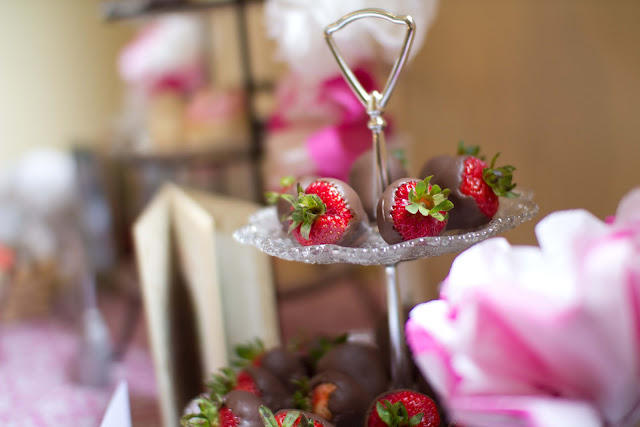We served Gigi's Cupcakes (yum!), chocolate covered strawberries, fresh fruit, homemade sausage balls, cinnamon rolls, and mini blueberry muffins. We also had some chocolates and pink candies to snack on!