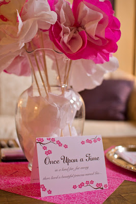 We went with Cherry Blossoms for the invitations and other decor as a tie to Gia's Korean heritage. The invites, envelopes, inserts, stickers (for party favor bags), and place card holders were all created on