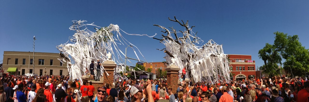 Last weekend, we went to Auburn for a very special event. It was the final rolling of Toomer's Trees - the beloved oaks that sit at Toomer's Corner. Our beautiful trees had been poisoned by an ignorant, hateful Alabama fan more than a year before, and now they were dying. The University did everything they could to save them and now they were beyond hope. You can see in the pictures how terrible they looked. It was time to cut them down. But first - we were going to celebrate all our memories there with one final roll.
