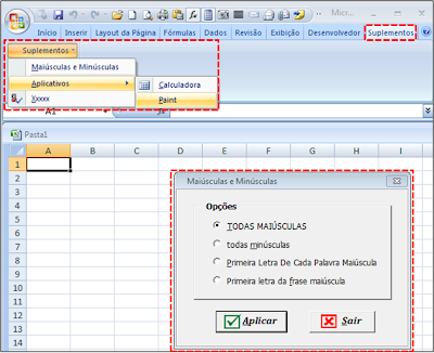 Para que possamos acionar estes comandos/ recursos, que estão inseridos no suplemento, criei um código (macro) que adiciona uma nova guia (no caso do Excel 2007) com o suplemento e um menu, conforme vemos na figura ao lado.