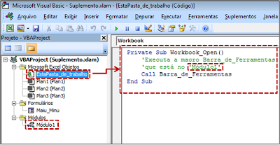 Ao lado, vemos o código que deve ser inserido na pasta de trabalho (EstaPasta_de_trabalho)para que o menu 'Suplemento' seja criado quando o Excel é acionado.