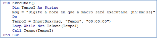 A figura abaixo, contém a macro que inicia o processo solicitando qual será o horário da execução da segunda macro. Digitamos a hora no formato já mencionado (hh:mm:ss) e clicamos em 'OK'. Lembre-se de que a hora digitada deve ser maior do que a hora atual do computador.