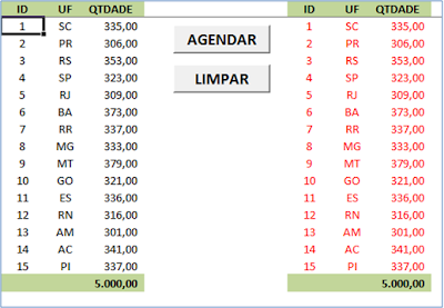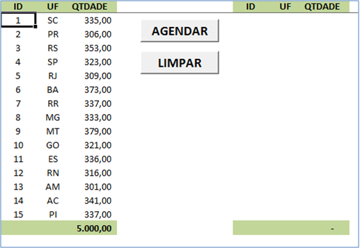 Na figura ao lado, vemos o exemplo de um simples lista de dados (colunas 'ID', 'UF' e 'QTDADE'). Nosso objetivo, é copiar todos os dados nas colunas a direita (que contém os mesmos nomes (cabeçalhos) em um horário a frente que vamos determinar.