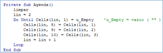 A macro acima, executa a macro 'Agenda' (que está abaixo), quando a hora atual do computador for igual a 'TempoI