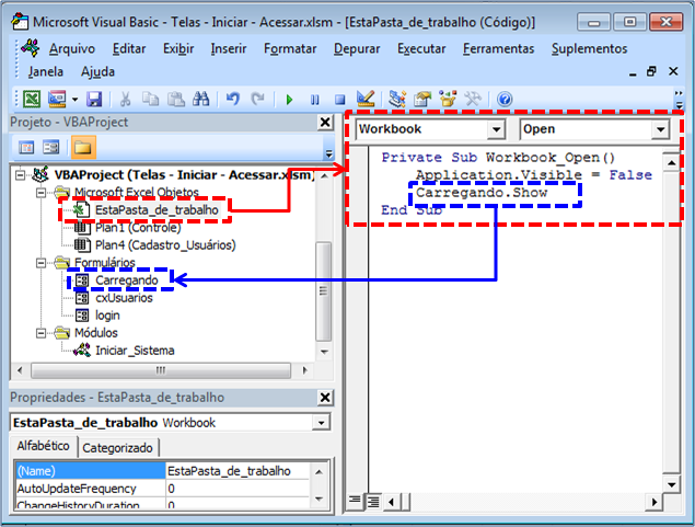 Na figura ao lado, também vemos que há um código inserido na 'Pasta_de_trabalho' (destaque em vermeho) que inicia um procedimento quando a mesma é aberta.