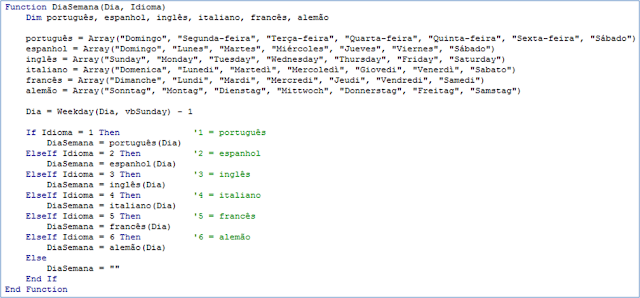 Na figura abaixo, vemos a macro/função que permite que o Excel escreva o dia da semana em 06 idiomas diferentes: Português, Espanhol, Inglês, Italiano, Francês e Alemão. Isto poderia ser ampliado para quantos idiomas fossem necessários ou desejados.