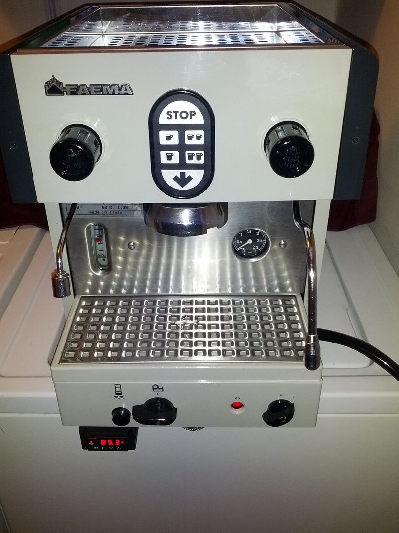 If anyone is interested in an excellent condition Faema Compact C84 please let me know. I am selling mine since I upgraded to a new machine. My Faema was purchased a little over a year ago from the owner who did a full frame off restoration of it. The frame was stripped, sandblasted and professionally powder coated, all components were descaled and gaskets replaced. Since I bought it I have installed some brand new solenoid valves, replaced the group gasket, screen, and also performed a full vibe-to-rotary conversion pump. In addition I installed a PID to monitor the group temp and also installed a time-delay solid state relay to adjust pre-infusion from 0-120 seconds. This machine truly is a beauty and is unique and in immaculate condition.