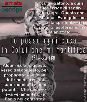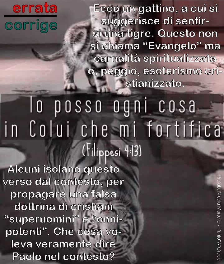 Attenzione alle trappole della carne, a quelle del misticismo carismaticista e a quelle dell’esoterismo cristianizzato. Alcuni abusano di questo brano per sentirsi «superuomini» e per propagare un «onnipotentismo» cristianizzato. Paolo parlava di «ogni cosa», riferendosi alla sua situazione di dover avere tempi di strapazzi, angherie e penuria a causa del regno e della gloria di Dio; poi, c’erano certo anche tempi più positivi. Egli allenato abbastanza per vivere ambedue queste esperienze. Come si vede, basta spostare gli accenti o generalizzare, che si ha subito una dottrina differente o addirittura una falsa dottrina! {Nicola Martella}