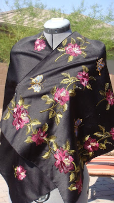 Black satin shawl with beautiful embroidered Merlot flowers with gold thread filaments, olive green embroidered vines and leaves with a touch of yellow and white.