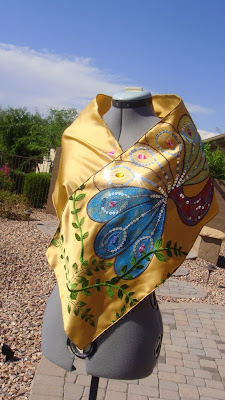 Peacock has lace fabric inlay in its feathers and body in lime green, turquoise and burgundy.