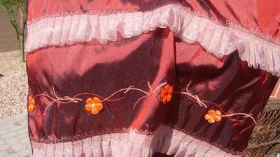 Wine colored Taffeta with embroidery , small peach colored ruffles of organza