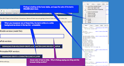 If you mouse over the links to the downloads, the background changes to white.  The color is supposed to be dark blue.  Firebug says it is dark blue.  Actual color is white and readable.