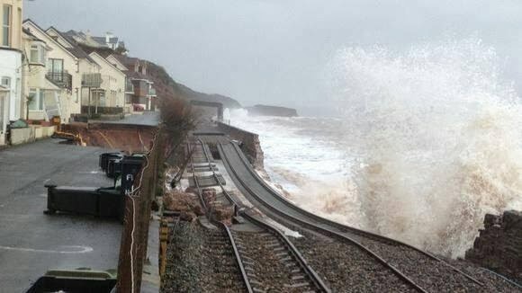 Le trafic ferroviaire est interrompu entre Exeter et la Cornouaille. La ligne de train passe tout près de la mer à Dawlish (et c'est d'ailleurs magnifique quand il fait beau et qu'il fait jour), mais les vagues ont détruit le mur de protection et les rails sont dans l'eau... Les images partagées sur le