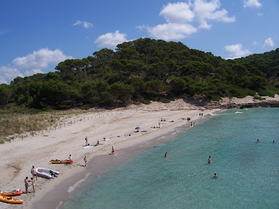 Mitjana (Mediana), de arenas blancas, agua turquesa, y enmarcada por rocas del mismo color que la arena.