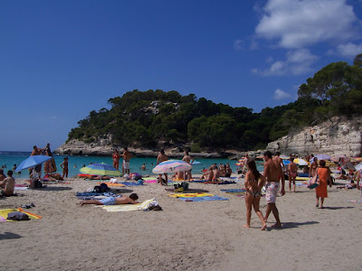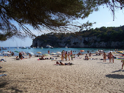 Macarella, otra cala famosa y todavía más llena de gente, pero al menos con lugar para dejar el coche cerca de la playa. Aunque el paisaje era brutal, y todavía hacía mucho calor a las seis de la tarde, el agua estaba llena de algas negras en la orilla, que hacían que poca gente se metiera (para muchos europeos, si hay aunque sea dos alguitas flotando, el agua está sucia y no se bañan). La verdad es que era un poco desagradable, pero dentro se estaba muy bien. De todas maneras duramos sólo una hora, y volvimos pronto al hotel.