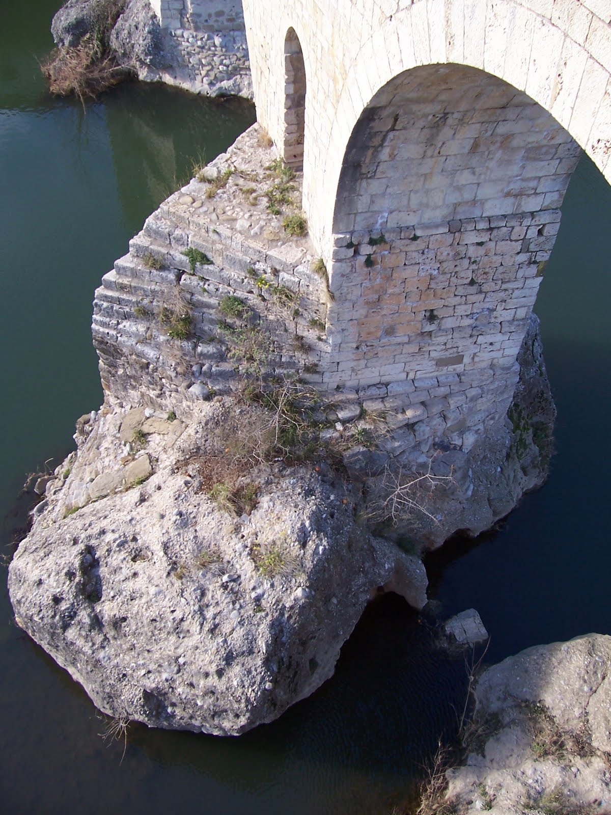 Uno de los pilares del puente, que parece tener un tipo de escalera que viene del agua y no lleva a ninguna parte.