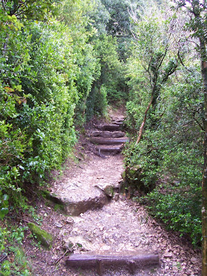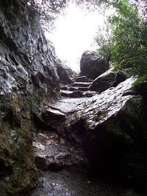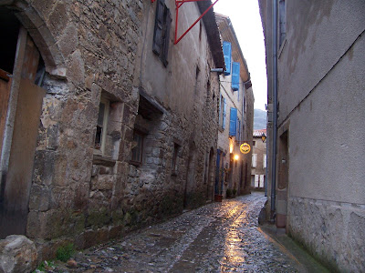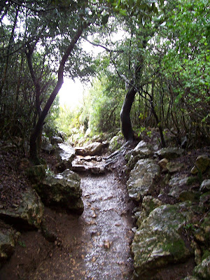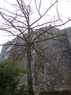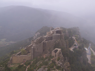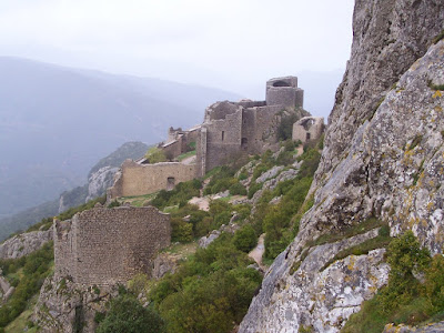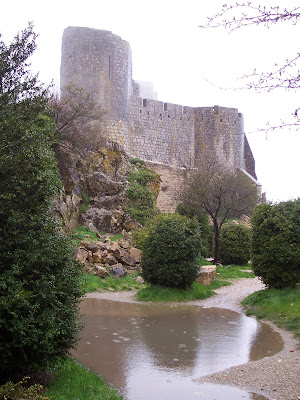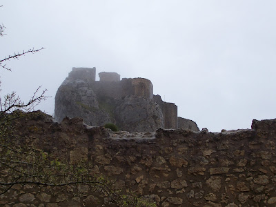 Peyrepertuse ("Piedra Recortada"). Aunque hacía un día incluso peor a los anteriores, era mi última oportunidad de subir a un castillo, así que pagué la entrada y me adentré solo en el bosque. El sendero era barro, raíces y charcos.