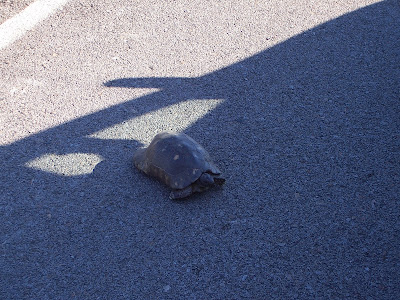 Capo d'Orso, llamado asĂ por una roca gigante que parece un oso. DespuĂ©s de ir descartando camino tras camino con el coche, descubrimos que la cala a la que pretendĂamos llegar era privada y no podĂamos acceder de ninguna manera. AsĂ que tuvimos que dar un rodeo bastante grande para poder seguir hacia el sur. En el camino, una tortuga gigante se asaba en el asfalto. Ya sĂ© que la foto es poco interesante, pero me gustan las tortugas, parecen como si llevaran milenios recorriendo la isla. La bañamos en agua pero no pareciĂł hacerle demasiada gracia, aunque tampoco estábamos seguros, las tortugas no se destacan por su expresividad.