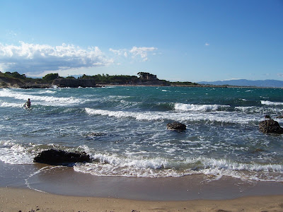 Salimos de las ruinas, atravesando un bosquecito de pinos, y aparecimos en una playa de médanos y muchas olas:
