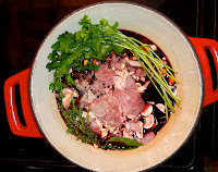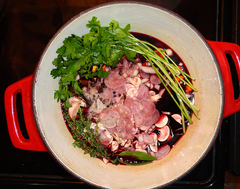 leeks, garlic, bay leaves, and thyme to the wine reduction. Before adding the